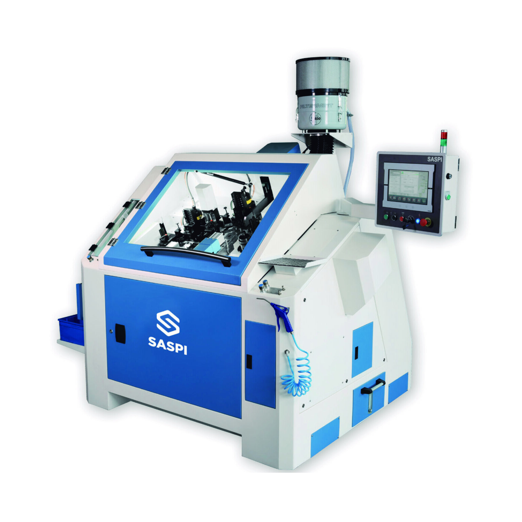 La DOM-16 es una máquina 3 en 1 con un cambio rápido y fácil gracias a su configuración totalmente motorizada (centrado, rieles, riel superior, profundidad de corte) y sistema de centrado de alta precisión controlado por la pantalla táctil.