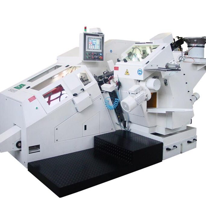 En nuestra máquina RGVP, se combinan una roscadora y una punteadora, para realizar en una sola alimentación los procesos de chaflanado y roscado o taladrado y roscado de las partes.